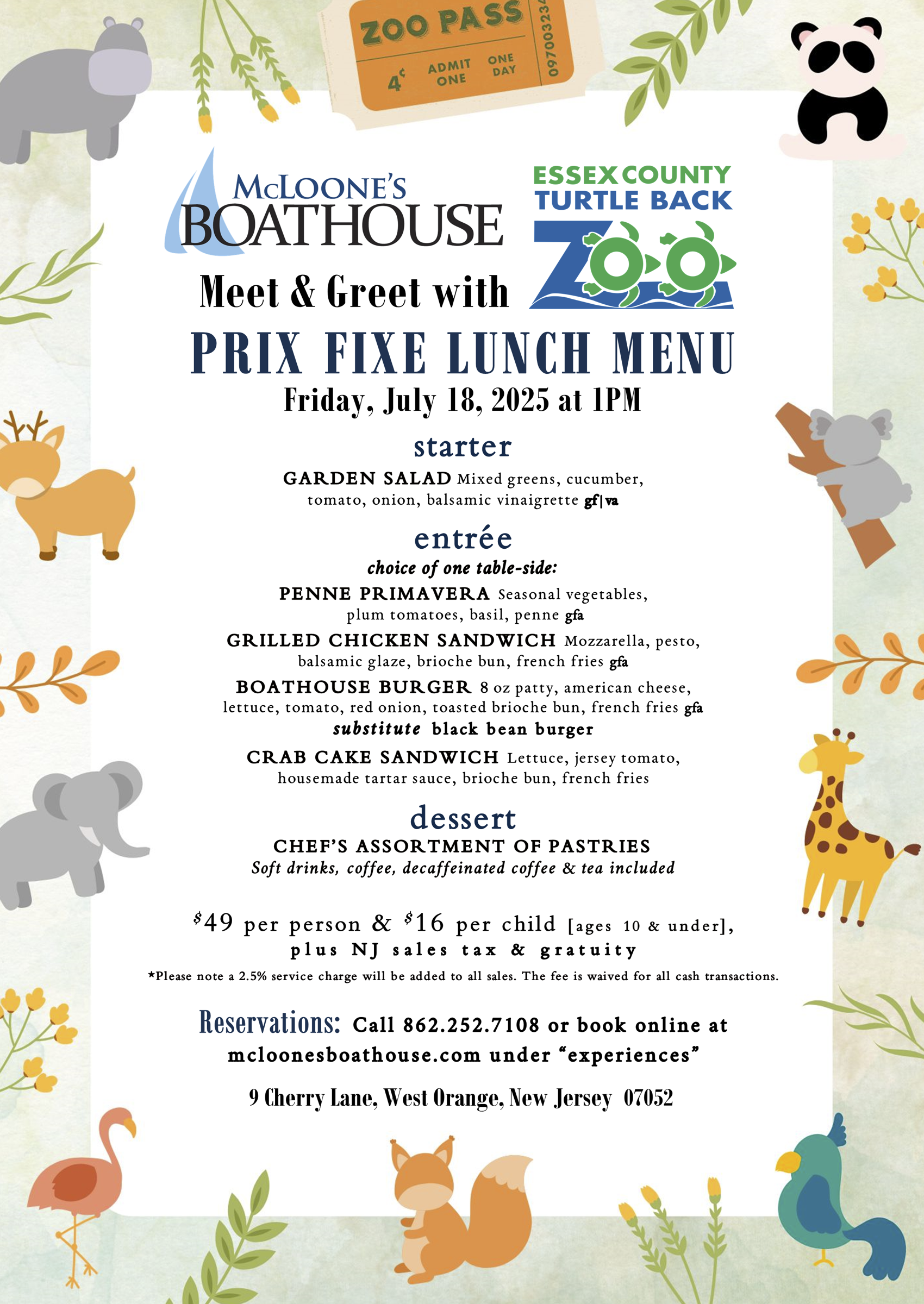 Planning to visit the zoo that day, too? Show your McLoone’s lunch reservation at the Turtle Back Zoo admission gate and receive discounted entry—just $15 per person!