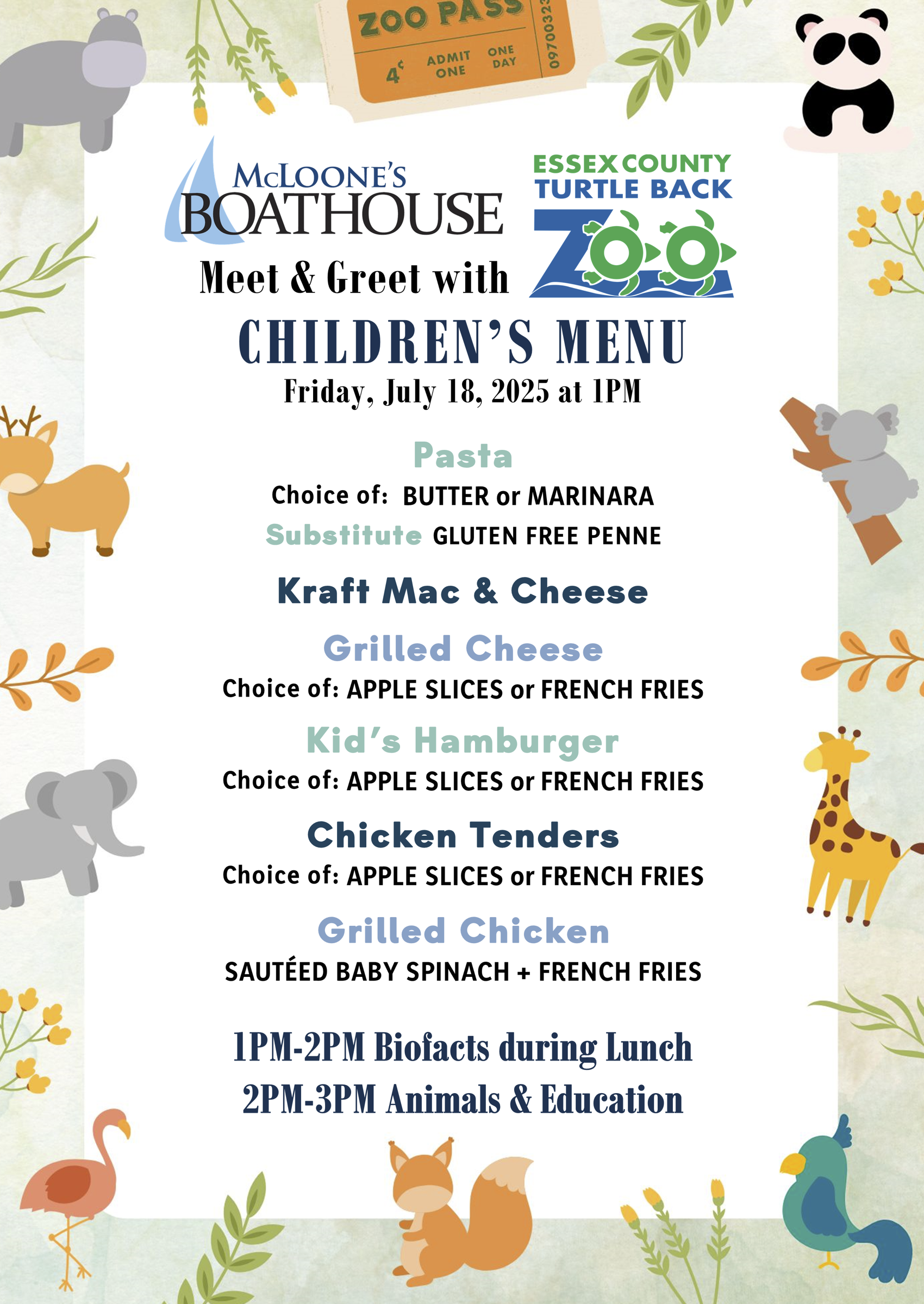 Join Essex County Turtle Back Zoo and McLoone’s Boathouse on Friday, July 18 from 1PM to 3PM for a special summer collaboration that’s perfect for families, animal lovers, and foodies alike.